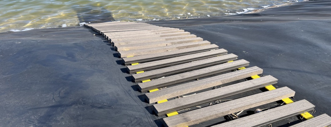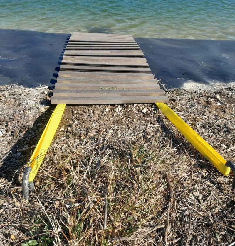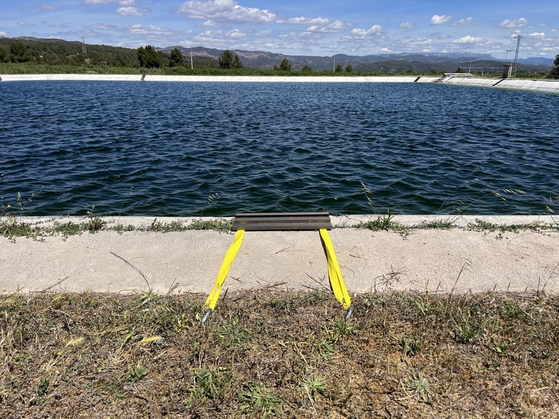 La fixació de la rampa es realitza a l'exterior de la bassa mitjançant piquetes enterrables en el terreny i un fleix tèxtil de polièster. Així doncs, la rampa es pot instal·lar i desinstal·lar fàcilment quan es consideri oportú, sense necessitat de buidar l'aigua de les basses.